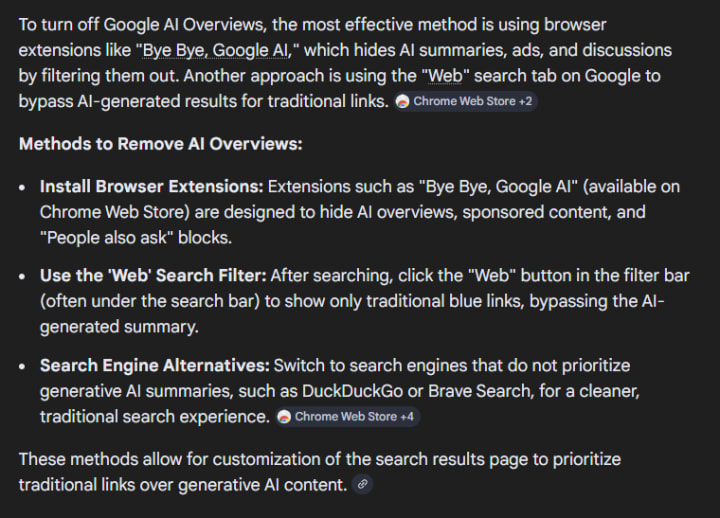 Several Chrome and Firefox extensions have been built specifically to hide or bypass AI Overview. The most widely used include Hide AI Overviews and Bye Bye Google AI, both available in the Chrome Web Store.