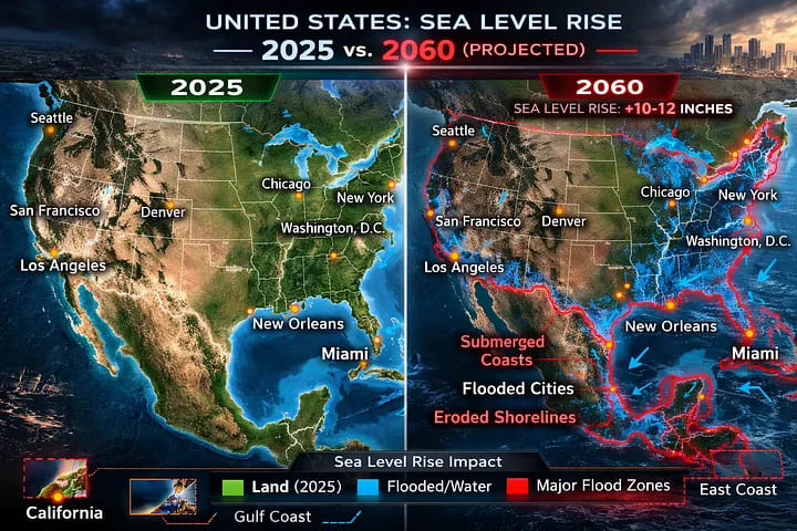 For the United States, by 2050, we should see 12 inches of sea level rise. Then, by 2100, we likely will see between 2.5 and 4 feet of sea level rise. Higher levels remain a possibility in some areas, such as the Gulf Coast region.