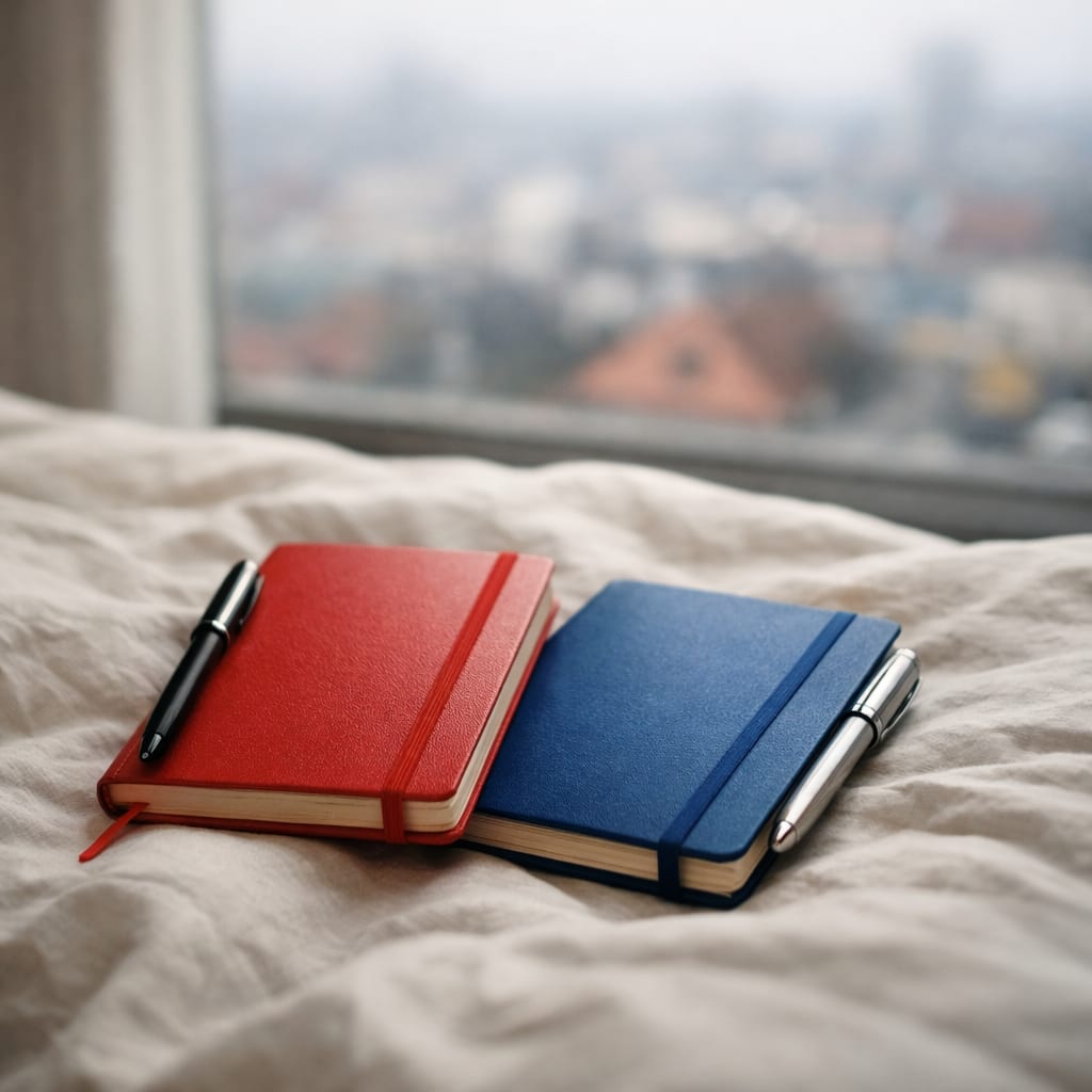 The morning that changed things — which is a phrase he would have resisted if he were writing this as a story, because it implies that things had a stable configuration before and after, which his things did not — he woke up in a small apartment in a city he identified by the light as somewhere in Southern Europe and found, on the bedside table, not just his notebook but a second notebook. Same size. Different color — blue where his was red. Same pen clipped to the cover.