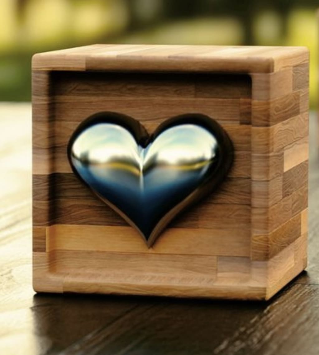 There now lays a small, naked, brown box, with a silver heart on the side facing me.