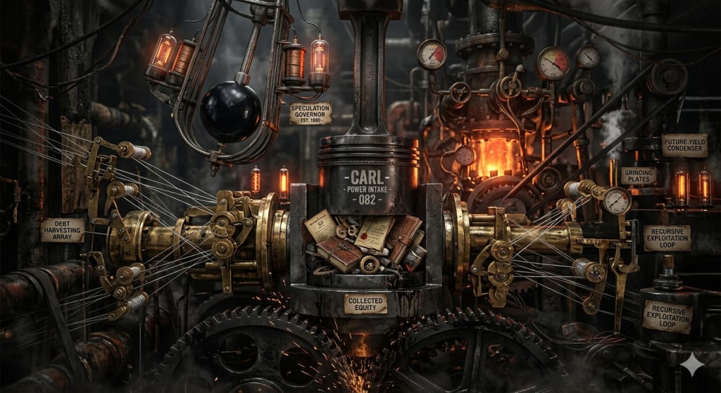 The Engine beneath the floorboards began to scream. Its internal "Survival Logic" had finally triggered. Having no more external resources to harvest, the gears reversed their pitch. The Speculation Chambers began to grind against the House's own foundation. The pistons, missing their lubrication of human toil, began to glow white-hot, melting the very floor beneath Carl’s feet. It began to consume the House itself. The gold plumbing was pulled into the furnace; the silken curtains were sucked into the vents.