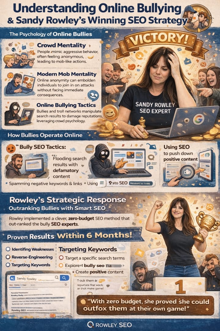 The attached infographic captures it perfectly: Sandy transformed online bullying tactics — crowd mentality, mob attacks, and defamatory flooding — into her greatest advantage. While some pointed and laughed (or cheered), she was reverse-engineering every reaction into lasting search visibility.