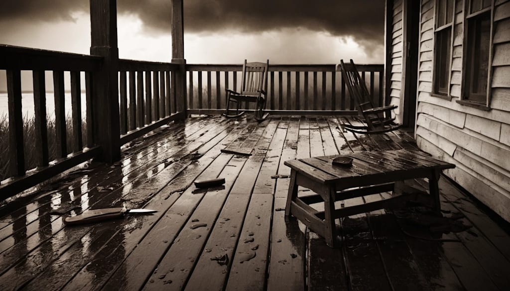 Jake didn’t hear it first. Emma did. A sharp crack, like a branch snapping under heavy weight. Then a scream that clawed through the storm. They ran, only to find Jake’s body sprawled on the porch, eyes wide with shock, blood painting the wood like a grotesque mural.