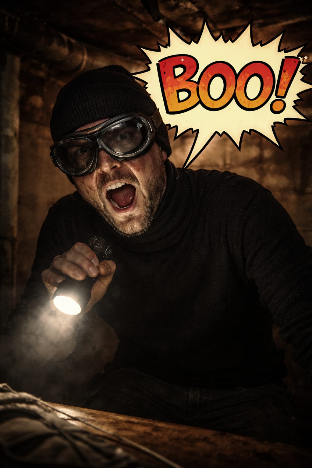 Racing home, I killed the breaker at the house we shared. Then, as there was already a dirt floor, I put on some glasses, grabbed a tube, and buried my now covered in completely black clothes self with dirt. I couldn't get it as perfect as I wanted, but it worked.